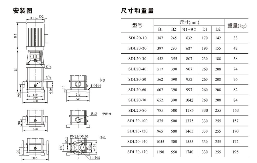 SDL20/SDLT20為配用標(biāo)準電機的非自吸立式多級離心泵,電機軸和泵軸用聯(lián)軸器直接聯(lián)接,把拉桿用螺母將外筒,過流部件固定在支架和進出水體之間,泵進出水口在泵底部的同一直線上。泵可根據(jù)需要配置智能保護器,對泵的干轉(zhuǎn)、缺相、過載等進行有效的保護。
