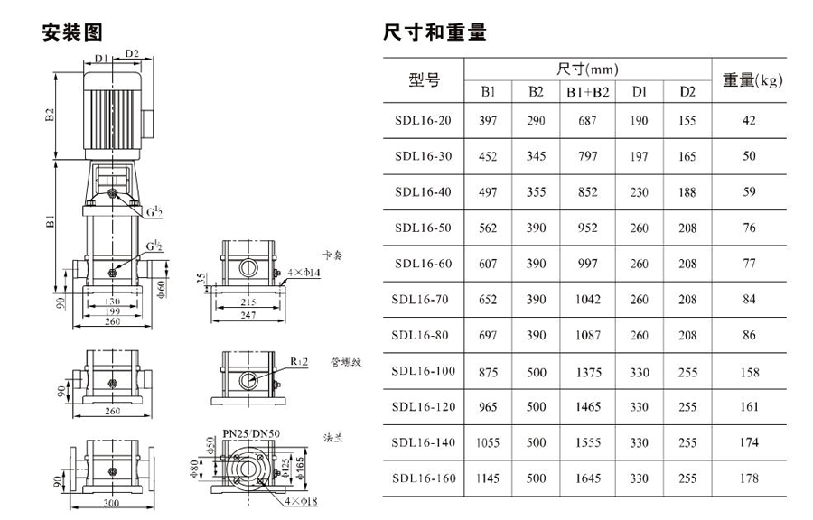 SDL16/SDLT16為配用標準電機的非自吸立式多級離心泵,電機軸和泵軸用聯(lián)軸器直接聯(lián)接,把拉桿用螺母將外筒,過流部件固定在支架和進出水體之間,泵進出水口在泵底部的同一直線上。泵可根據(jù)需要配置智能保護器,對泵的干轉(zhuǎn)、缺相、過載等進行有效的保護。